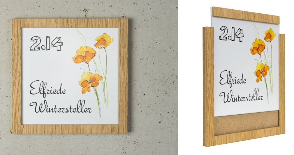 Natuurlijk eikenhout met snelle tekstwijzigingen. Een bewegwijzeringssysteem met een achterplaat van 4 mm en een frame van MDF met rustiek eikenfineer. Een breukvast, antireflecterend Axpet-paneel wordt ingelegd met een dunne aluminium of stalen plaat. De stalen plaat wordt gebruikt wanneer de inzetstukken met magneten worden bevestigd. Afmeting van 151x151 mm met een inschuifblad van 131x131 mm.