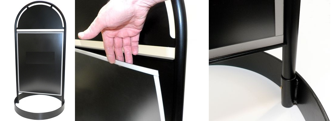 Nostalgisch buiten stoepbord met een geintegreerd topbord. Het robuuste plaatstalen frame is zwart gespoten (RAL 9005) en is tevens dubbelzijdig voorzien van een magneetlijst. De magneetlijst is geschikt voor A1 posters. Exlusief poster en belettering; indien gewenst kunnen wij deze tegen meerprijs leveren/verzorgen. Aanbiedingsprijs tot 1 oktober a.s.