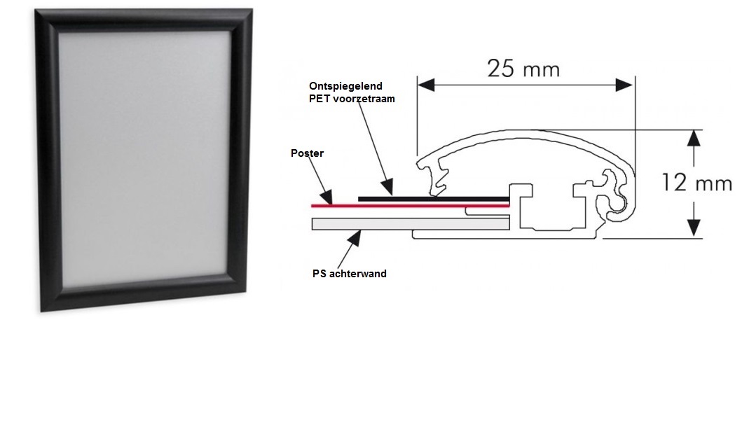 Wissellijst zwart geanodiseerd aluminium, incl. anti-reflex PVC-folie.